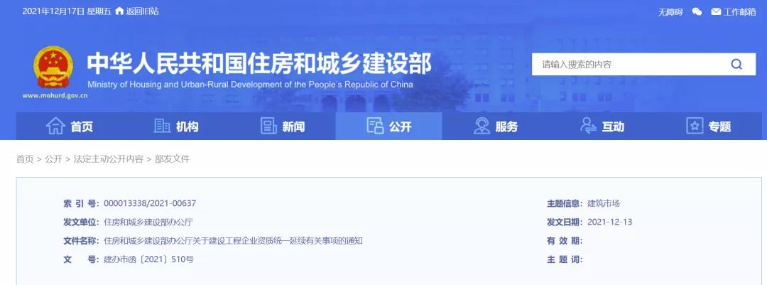 住建部:建设工程企业资质有效期届满的,统一延期至2022年12月31日。