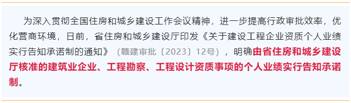 日前,江西省住建厅印发《关于建设工程企业资质个人业绩实行告知承诺制的通知》(赣建审批〔2023〕12号),明确:由省住房和城乡建设厅核准的建筑业企业、工程勘察、工程设计资质事项的个人业绩实行告知承诺制。
